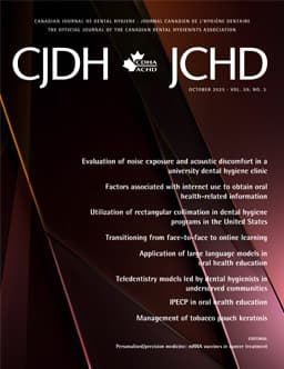 The Canadian Journal of Dental Hygiene (CJDH), established in 1966, is the peer-reviewed research journal of the Canadian Dental Hygienists Association. Published online in February, June, and October, CJDH welcomes submissions in English and French on topics of relevance to dental hygiene practice, education, policy, and theory.